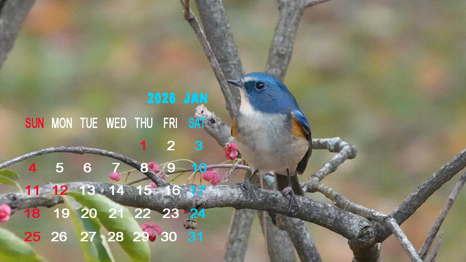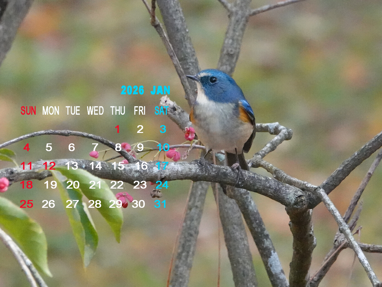 2026年1月のカレンダー(ルリビタキ Red-flanked bluetail)配信中 12月25日更新