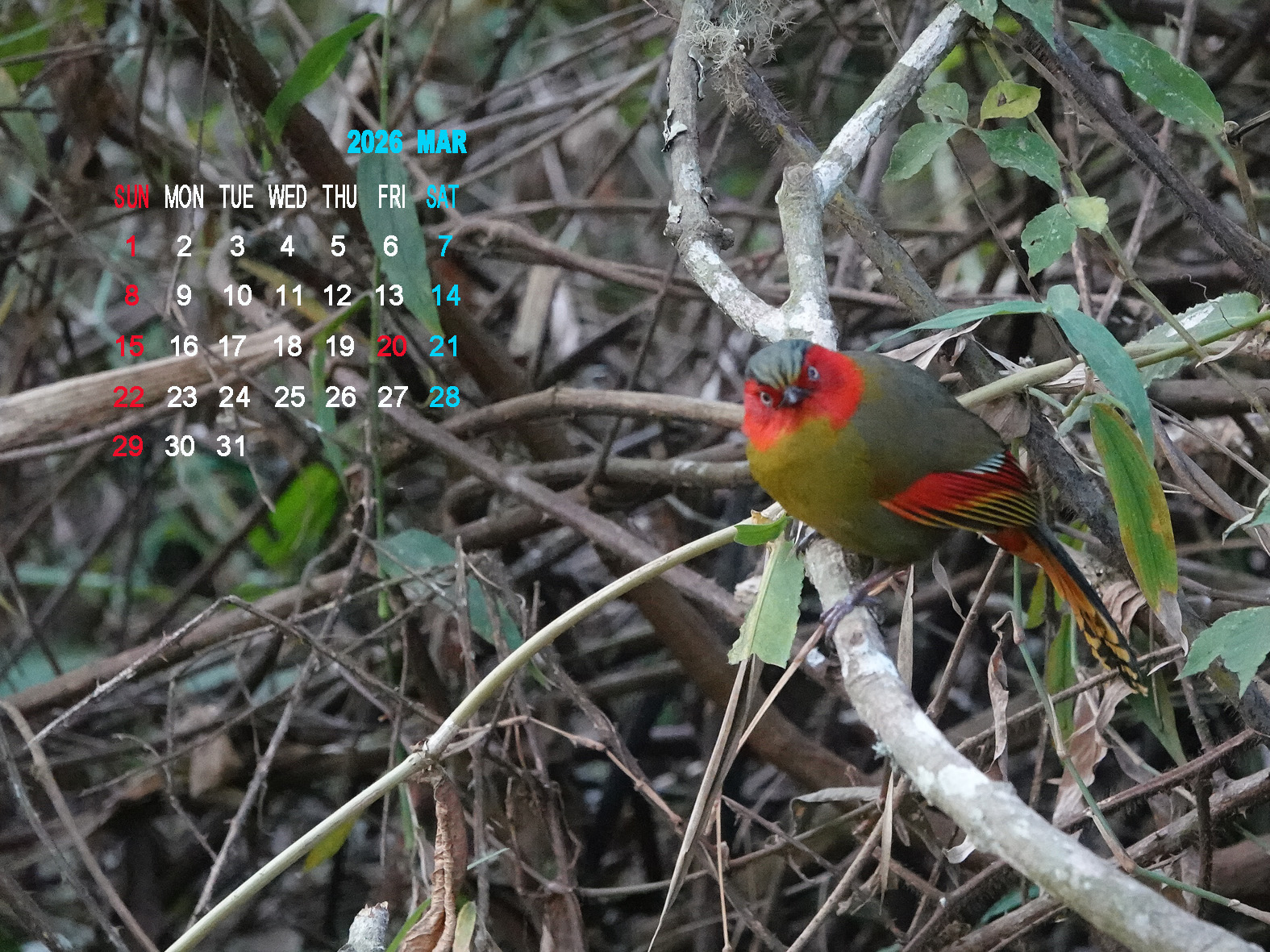 2026年3月のカレンダー(ヒガオヤブドリScarlet-faced Liocichla )配信中