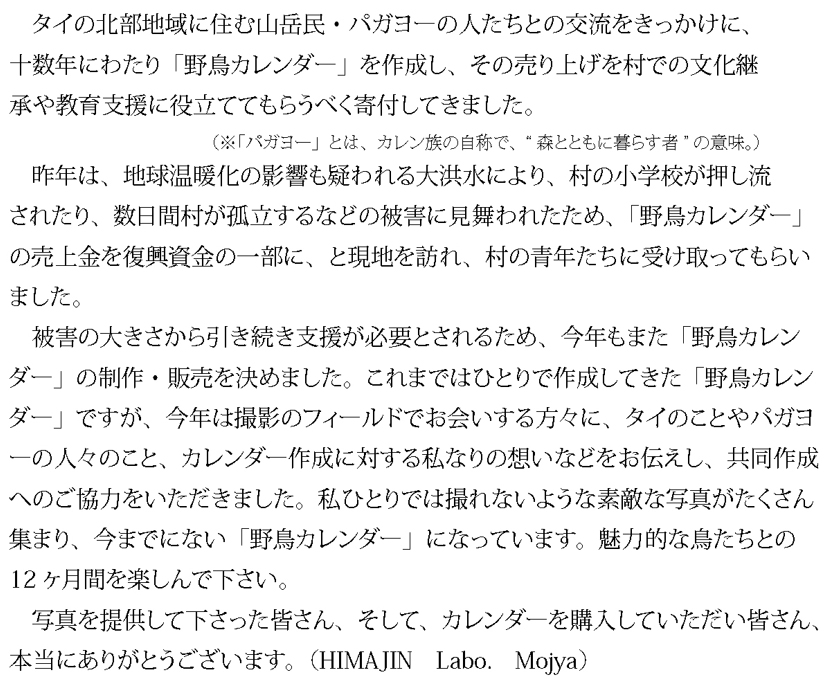 このカレンダーは表紙表紙に記してあるようにタイ・パガヨー(山岳民族)への支援金の募集として企画されています。販売価格は1部600円(2部で1部500円)でお願いしています。 ご協力いただけたら幸いかと思います。 ご不明な点があれば までメールをいただければご回答いたします。